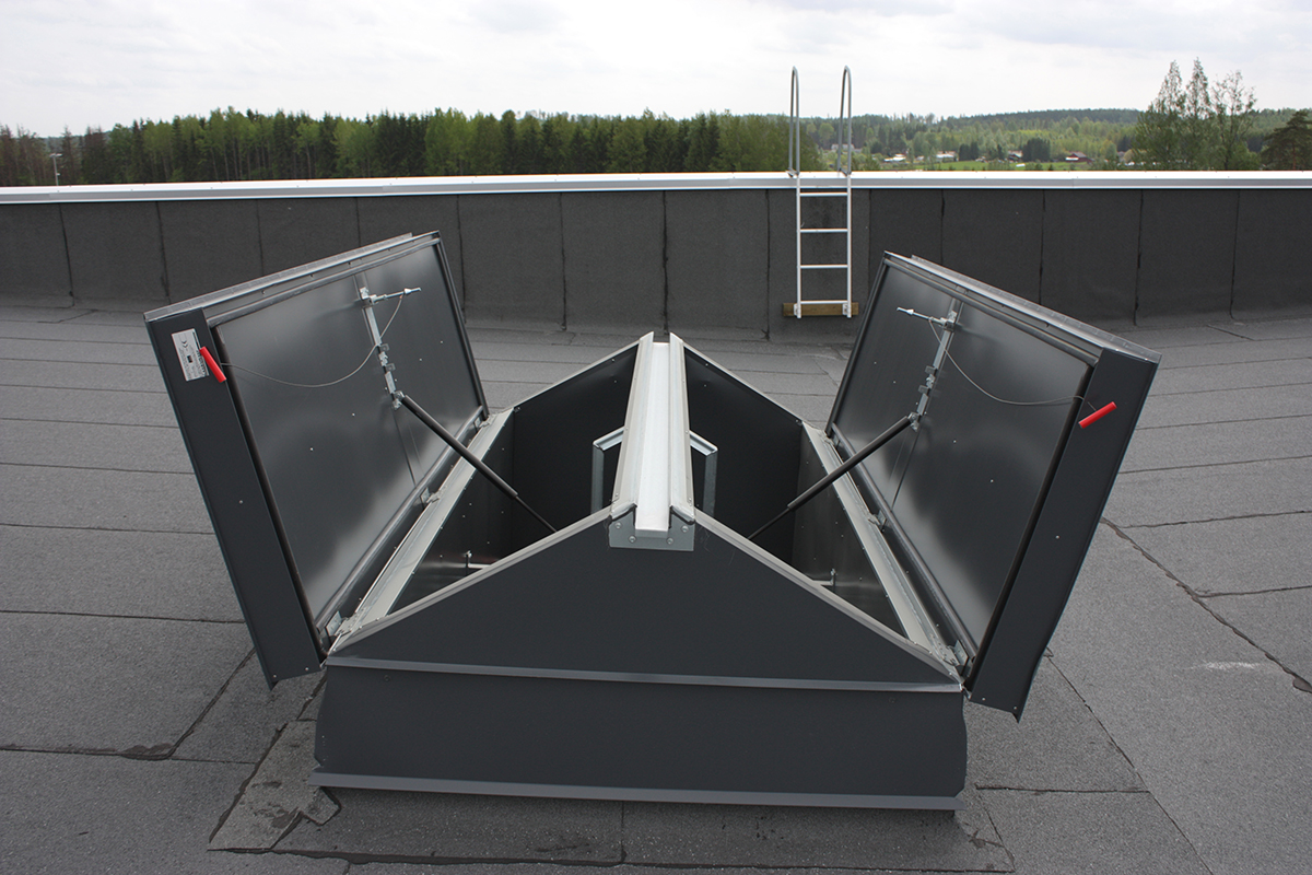 Branngassventilasjon UPP-2L har to lokk i standardutførelse og åpnes med hjelp av gasstrykkfjær og en smeltesikring. Åpningen skjer ved en gitt temperatur når smeltesikringen løser ut. Før manuell åpning fra taket finnes et utvendig drahåndtak.